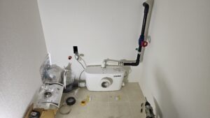お世話になります。ずっとサボってたブロク書きます(笑)今回はトイレと洗濯化粧台の工事です。現場はマンションの一階で元々、洋服屋さんだったのかな?今回リフォームで学習塾になる予定です。で、水道工事ですが、この現場は洗面が1つ有るだけで他には水道設備が有りません💦ですが、今回トイレも取り付けなければいけません。本来なら太い配管をトイレ用にもってこなければトイレが付かない‼️床は土間コンクリート、外から壊して配管なんてとんでもなくお金がかかります‼️この現場だとだいたいそれだけで100万以上😖悩みました、探しました、見つけました(笑)元々使ってた洗面台の排水Φ50の細い配管でも使えるトイレ‼️‼️それが今回取り付けた何処でもトイレ(笑)SFA!サニアクセス!押し入れだろうと2階だろうと駐車場だろうと、何処でも水回りが設置出来ます!大工工事が必要なく細い配管を延ばすだけ(笑)電気は必要です。20ミリや25ミリの配管伸ばして外の排水マスや、家の何処かの排水に繋ぐだけ😄なので楽勝です😀外から水道配管して、排水も一緒に配管して、電気屋さんに電気も配線してもらって完成(笑)イメージはエアコンの取り付け穴位ですかね壁の穴は😄トイレ設置で悩んでる方、水回りを増やしたい方、介護が必要な方、数十万から数百万掛かるリフォーム工事、現場によりますが半額以下で出来ますよ。ご検討宜しくお願い致します。誠設備工業にご相談下さい🙌