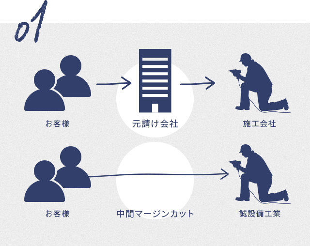 当方は、自社施工で水回りリフォームを行っております。直接お客様とやり取りをするため、仲介手数料が発生しません。適正価格での水回りリフォームが可能です。
